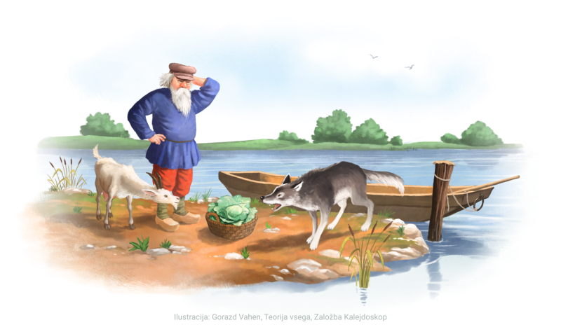Zgodba pripoveduje o kmetu, ki je na trgu kupil volka, kozo in košaro zelja. Ko pride do reke, mora na nasprotni breg spraviti volka, kozo in košaro zelja, pri tem pa lahko uporabi čoln, v katerega lahko vsakokrat vzame samo volka, ali kozo, ali zelje. Če bi namreč v čoln vzel tako kozo kakor zelje, bi se ta lahko potopil. Njegova težava je, da ne sme pustiti volka samega s kozo, saj bi jo volk požrl, ne sme pa pustiti tudi koze same z zeljem, saj bi koza pojedla zelje. Ta problem lahko najdete tudi pod imenom brodnikov problem.